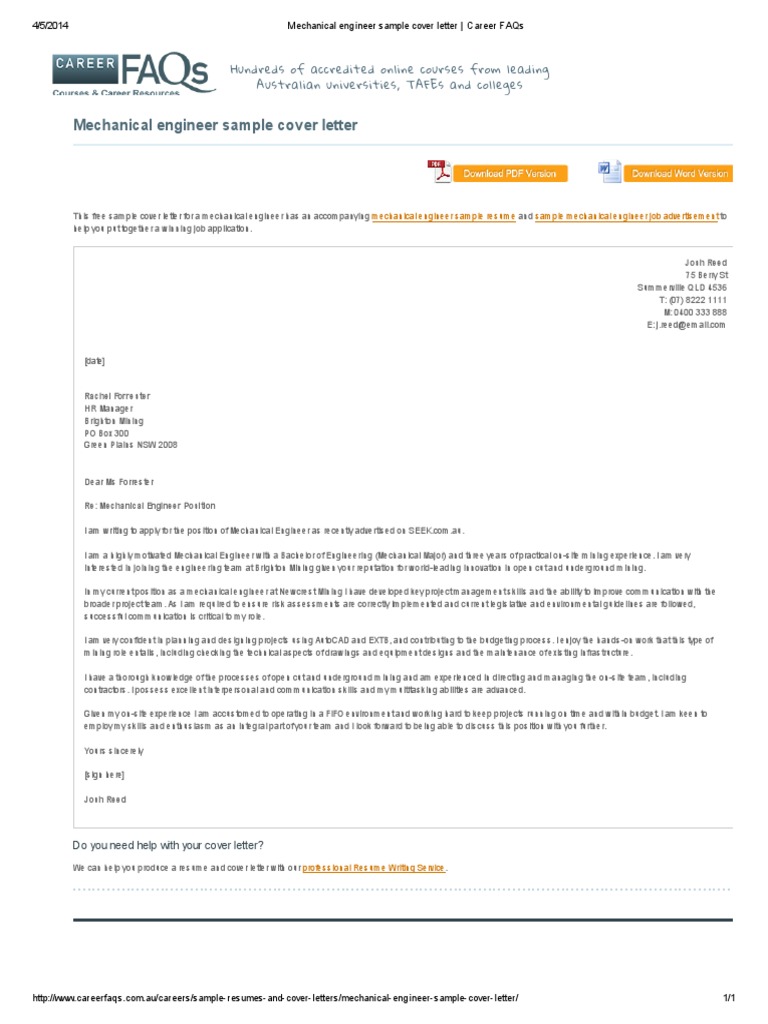 Use and adapt this free cover letter samples to learn the best way to write your own powerful winning cover letter for mechanical engineering positions